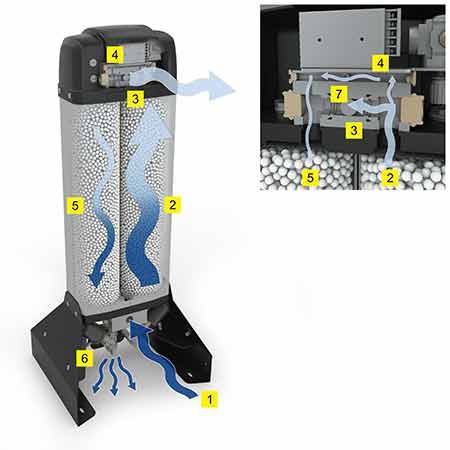 5. This regeneration air flows downwards through the saturated desiccant of the other column and regenerates the desiccant by adsorbing the moisture