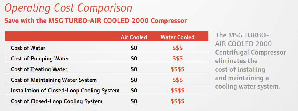 The MSG TURBO-AIR COOLED 2000 centrifugal compressor is designed for applications where there is a limited supply or no water available for cooling.