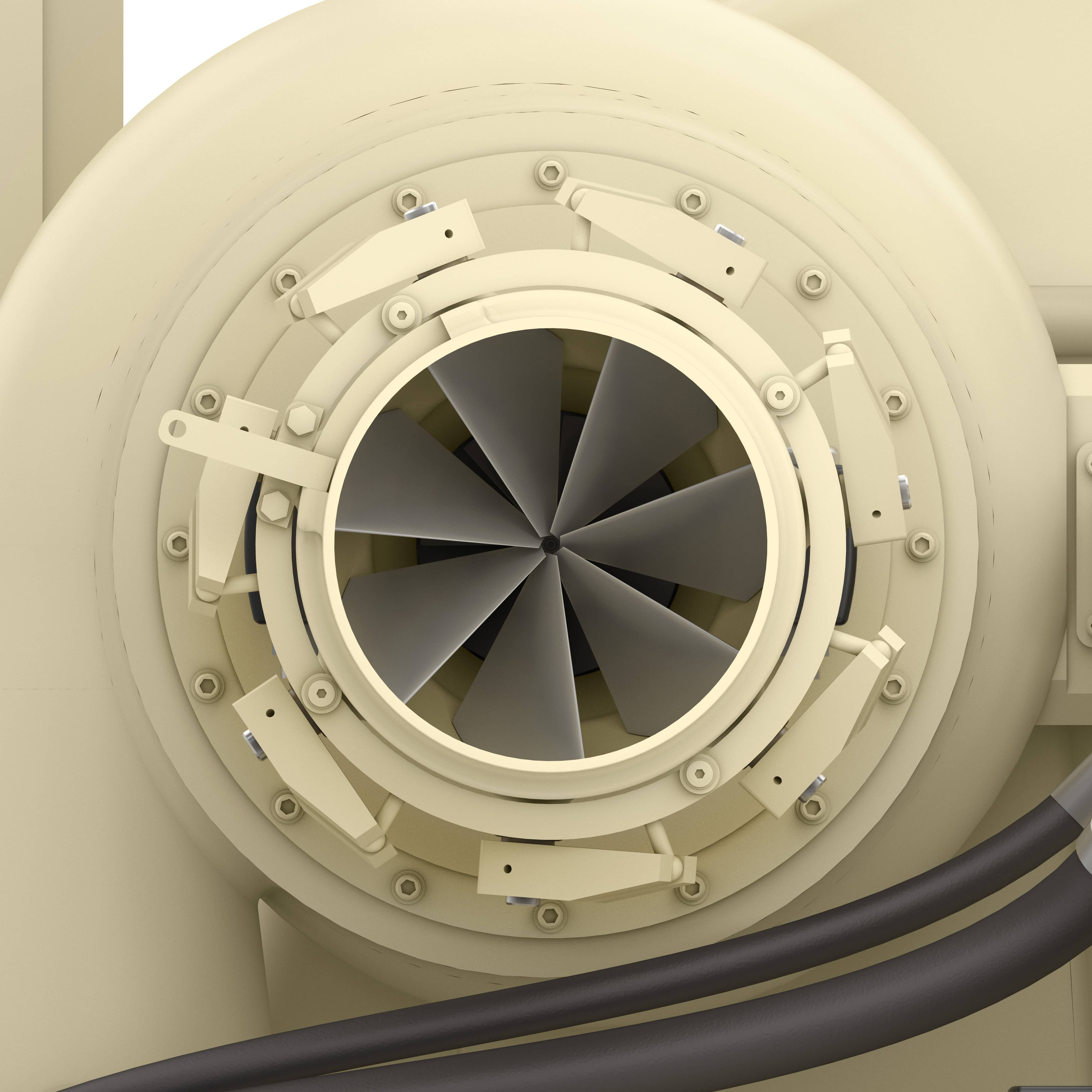 O conjunto de palhetas guia de entrada de última geração oferece a melhor faixa de turbilhonamento da categoria, juntamente com baixa queda de pressão para otimizar a eficiência geral do sistema em múltiplos pontos de operação.
